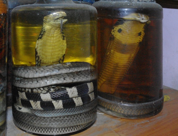 Další velmi častou podobou hadů ve Vietnamu je jejich přítomnost v alkoholu. Hadi naložení v lihu, známí jako hadí víno, jsou k vidění na trzích, v obchodech s tradiční medicínou i v domácnostech. Pije se po malých doušcích a je vnímáno spíše jako posilující prostředek než běžný alkohol. Zda skutečně funguje, je otázka víry, každopádně ve Vietnamu má tato tradice dlouhou historii.